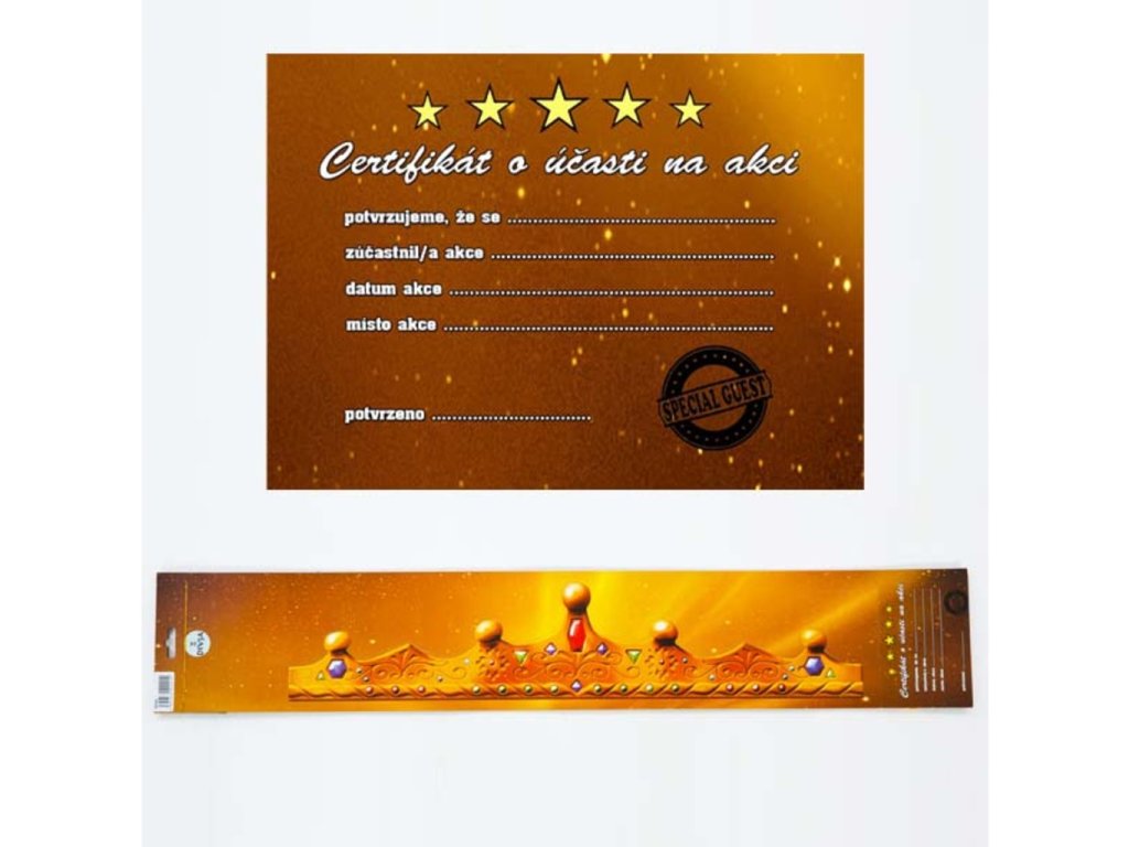 - Součástí balení je korunka z tvrdého kartonu a certifikát o účasti na akci.