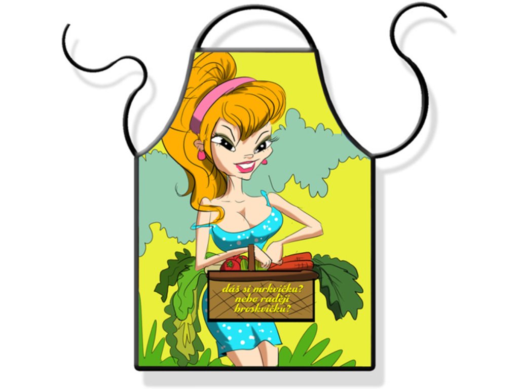 Má Vaše partnerka či žena smysl pro humor? Potěšte ji, a také sebe, touto netradiční zástěrou - Dáš si mrkvičku? Zástěra s humorným vzhledem Vám odhalí daleko více, než byste čekali. Až se na Vás žena v kuchyni obrátí s dotazem: Dáš si mrkvičku, nebo raději broskvičku? Pak ji zaručeně neodoláte. Vtipná zástěra - Dáš si mrkvičku? je originální dárek pro všechny kuchařky a jejich manžely.