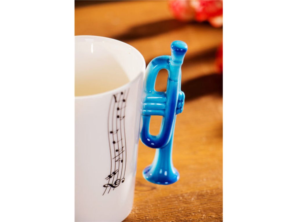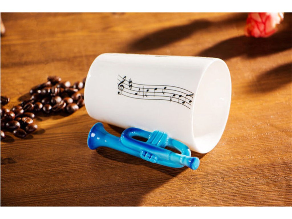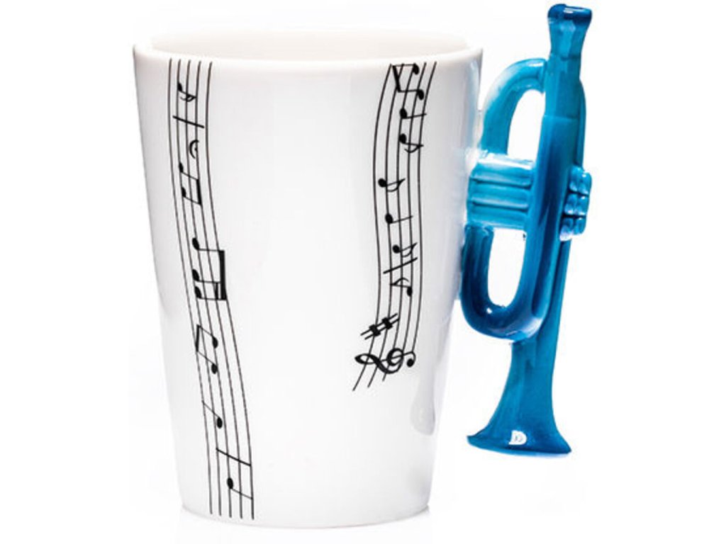 Máte v rodině nebo mezi blízkými někoho, kdo hraje na trumpetu? Pak tu máme ideální dárek v podobě hrnku trumpeta, který rozproudí každé ráno s šálkem kávy či čaje. Místo klasického ouška má hrnek vytvarovanou trumpetu a celý hrneček je potištěn notami. Aby každé Vaše ráno bylo inspirativní jako příjemná hudba. Udělejte hrnečkem radost například k narozeninám nebo k svátku. Hrnek trumpeta je originální dárek pro trumpetisty a všechny milovníky hudby.