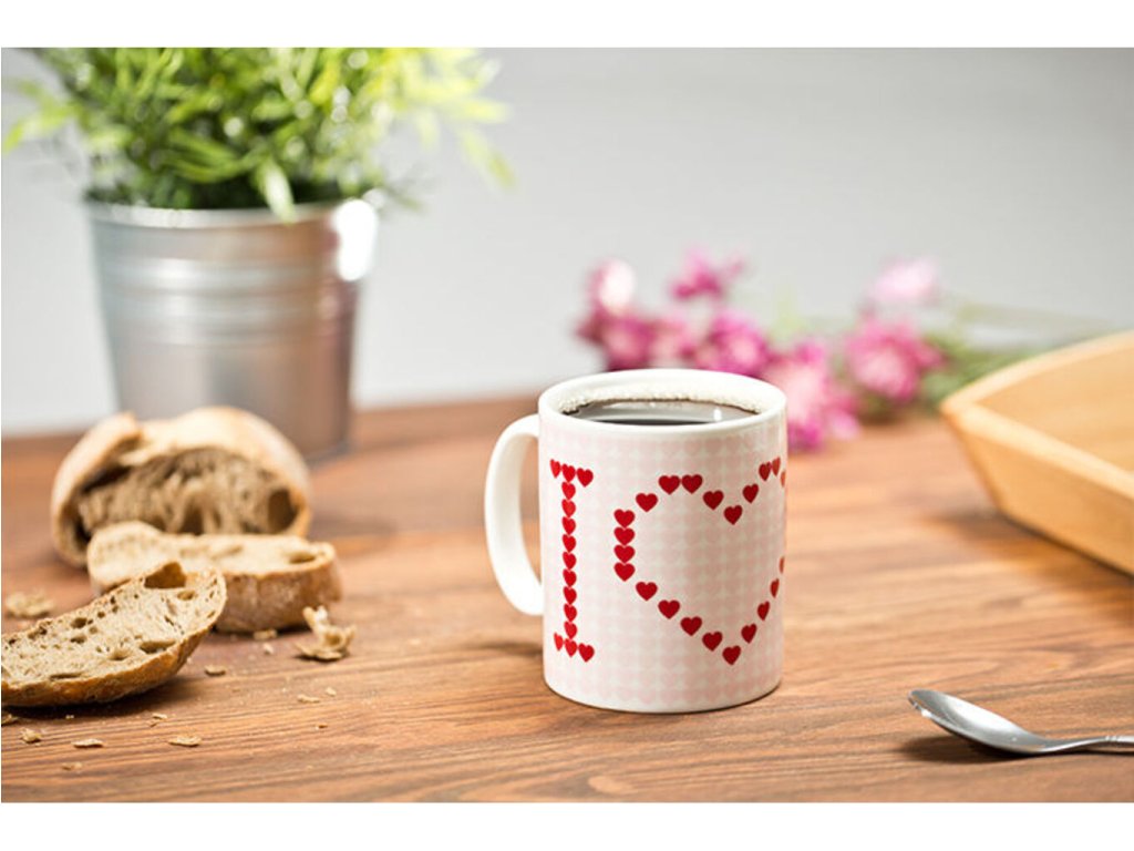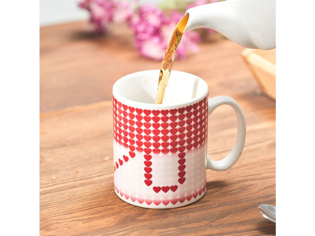 Vaříte často své drahé polovičce čaj nebo kávu ke snídani? Darujte jí tento magický hrnek srdíčko, který vyjádří, jak moc Vám na ní záleží. Hrneček je celý pokryt srdíčky, ale jakmile do něj nalijete teplý nápoj, část srdíček zmizí a objeví se nápis, který Vaše city k ní vyjádří ještě mnohem víc. Originální dárek pro zamilované.
