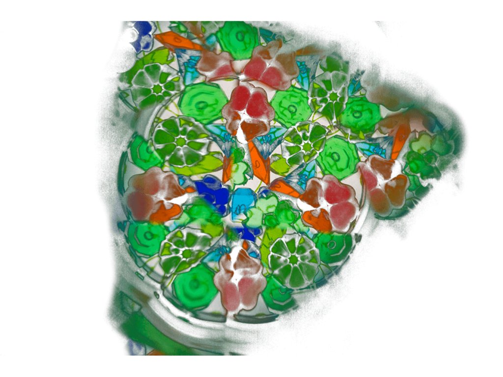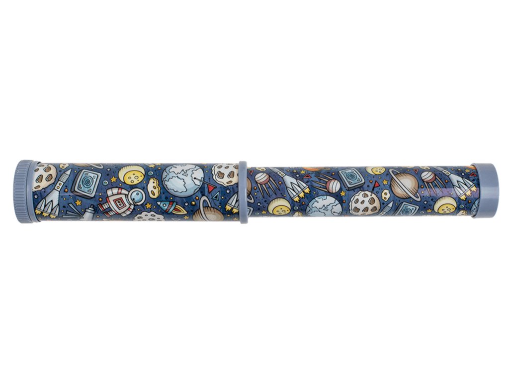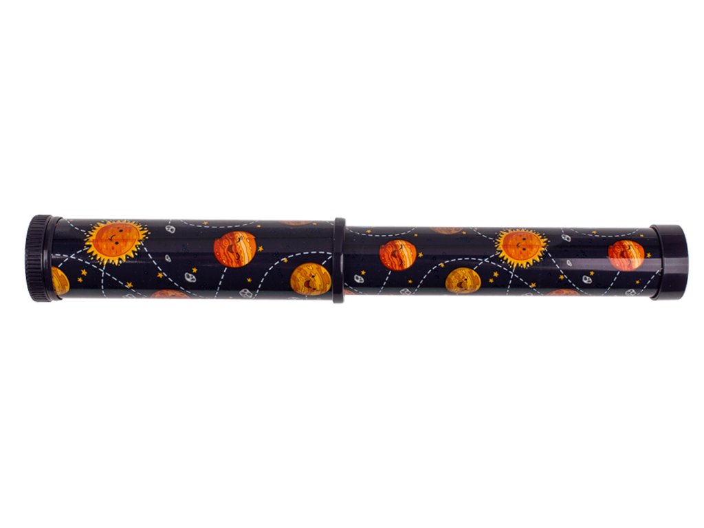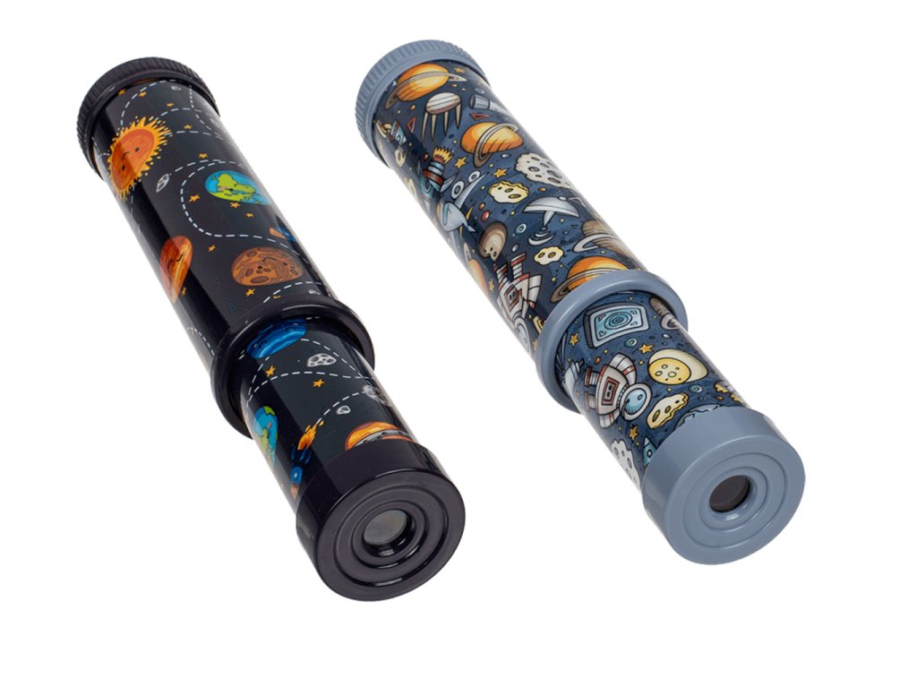 Pomocí soustavy zrcadel a barevných tělísek vytváří kaleidoskop neopakovatelné obrazce při pohledu proti světelnému zdroji. Abstraktní obrazce, které zaujmou malé i velké. Motiv planet je na vnější části kaleidoskopu. Uvnitř se mění barevné krystaly.