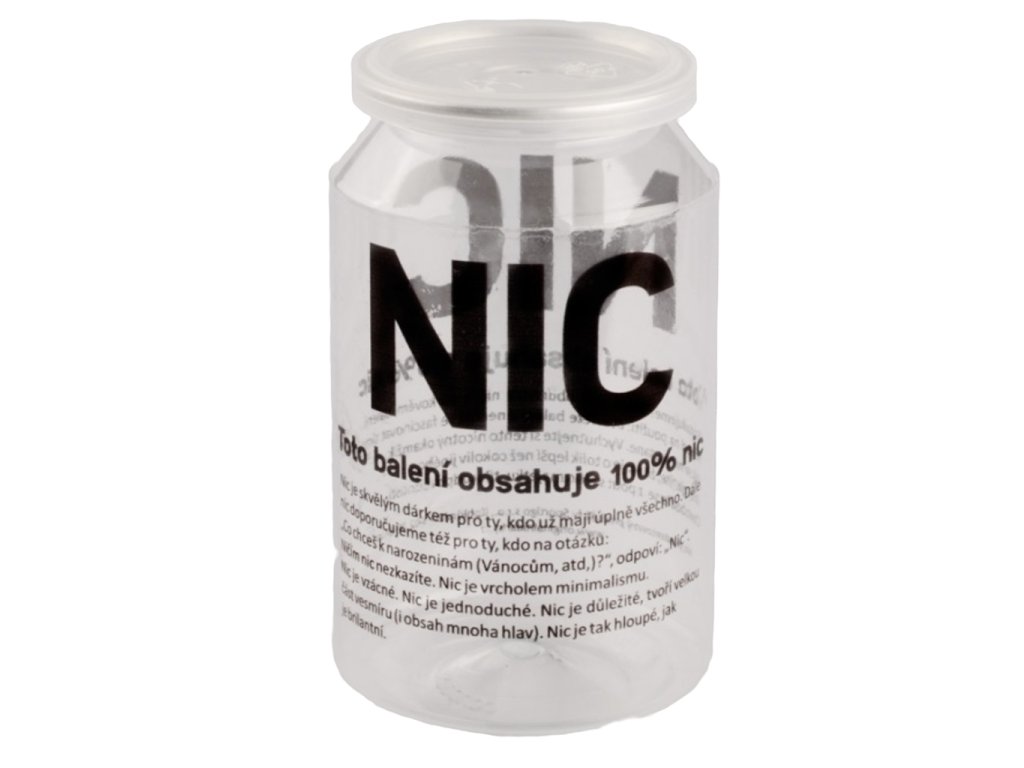 Nic v plechovce přesně vystihuje svůj název. Znáte odpověď NIC, když se ptáte svých blízkých, co by si přáli k Vánocům nebo k narozeninám? Tak tady to máte! Dárek s ničím, co si vlastně sami přáli. Vystřelte si ze svých kamarádů, příbuzných a dejte jim opravdu NIC. Plechovka je opravdu prázdná, nic neobsahuje. Takže, až přijde čas otázek, pořiďte si tuto skvělou srandovní věcičku a budete mít vyhráno. Nejen, že si z někoho vtipně vystřelíte, ale zároveň mu splníte jeho výslovné přání.