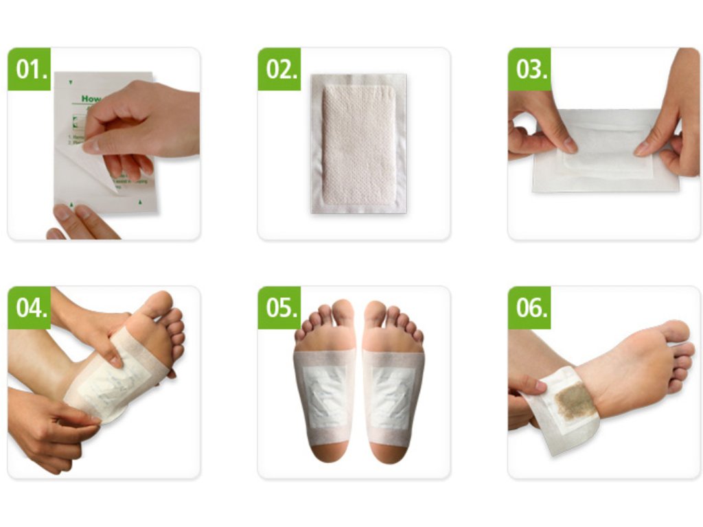 Vytáhněte sáček z fólie a jednu náplast. Odstraňte ochrannou fólii. Sáček s práškem umístěte do středu chodidla, přičemž potlačená strana směřuje dolů. Rovnoměrně rozmístěte na čisté, ne mastné chodidlo. Když použijete náplast na jinou část těla, současně použijte náplast i na obě chodidla. Používejte ponožky, které zabrání sesunutí náplasti ve spánku.