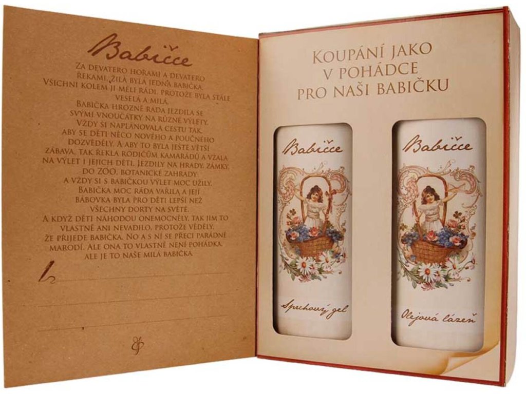 Darujte své babičce tuto nevšední knížku. Dárkové balení - kniha - Pohádka o babičce je krásným a milým dárečkem pro potěšení srdíčka každé babičky. Na první pohled se zdá, že se jedná o knížku. Uvnitř se však ukrývá sprchový gel a koupelová lázeň. Na úvodní straně naleznete průvodní text a vtipy na pohádkové téma. Celé balení je sladěno do pohádkového motivu. Sprchový gel a koupelová lázeň obsahují jemné mycí složky s eudermickými oleji z oliv a hroznů vinné révy. Přípravky zajišťují šetrné mytí a prevenci vysušování pokožky. Přípravek dále obsahuje extrakt z mořské řasy a levandulovou vůni. Zažijte pohádkovou koupel a pečujte o svou pokožku. Dárkové balení - kniha - Pohádka o babičce, je originální dárek pro všechny babičky.