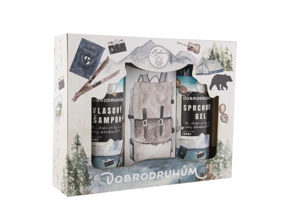 Dárkové balení kosmetiky pro všechny dobrodruhy. Vydejte se na cestu za dobrodružstvím. Balení obsahuje vlasový šampon 100 ml, sprchový gel 100 ml a ručně vyráběné mýdlo 100 g.
