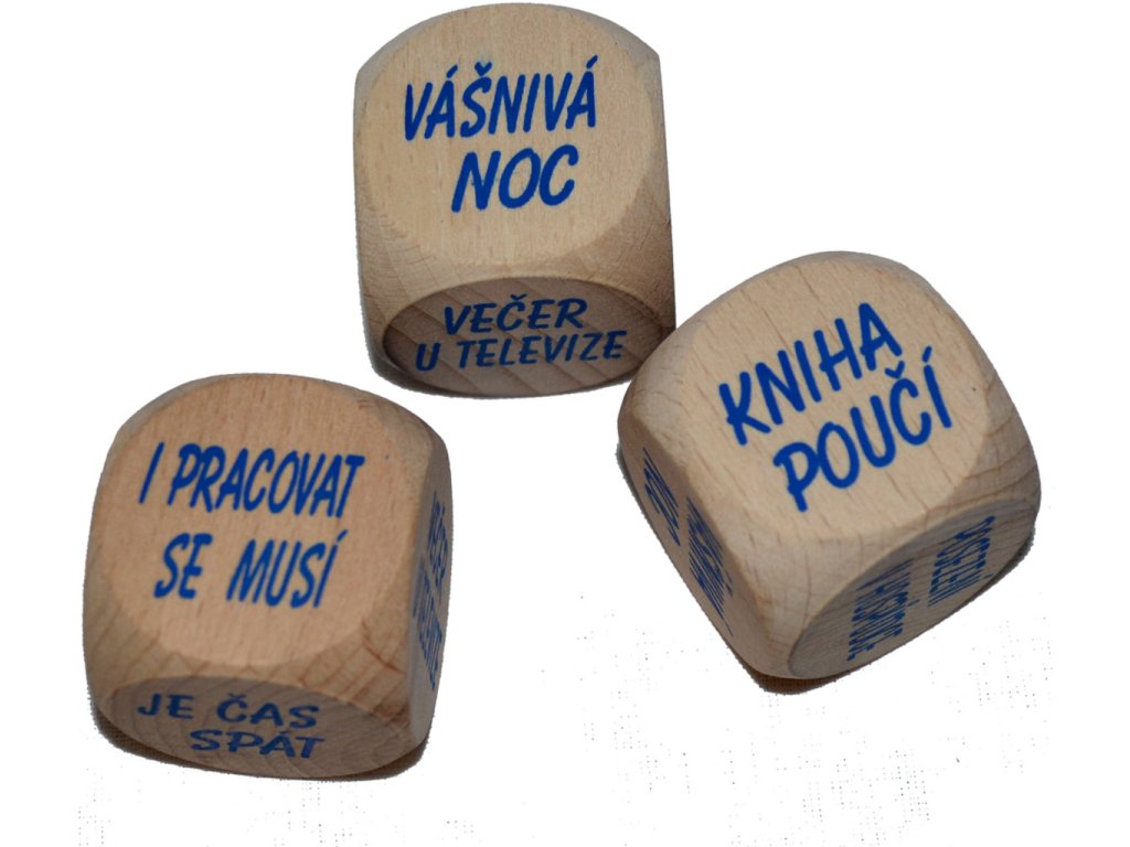 - Kostka (30 mm) na které jsou tyto nápisy: