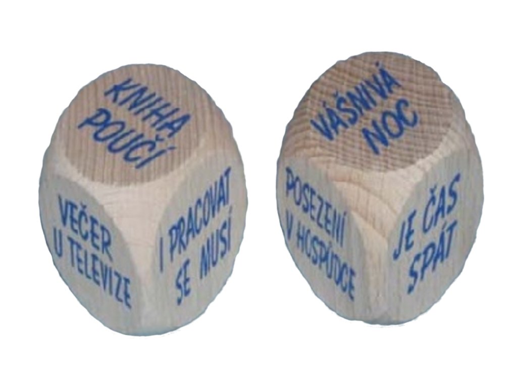 Nevíte si rady, co podniknout dnešní večer? Možná Vám poradí tato vtipná kostka - Co večer. Stačí hodit kostkou a ta Vám vzápětí ukáže a poradí, co můžete podniknout. Půjdete spát, budete pracovat, nebo zažijete vášnivou noc? To vše Vám může kostka poradit. Darujte tuto humornou kostku svým blízkým a až si nebudou vědět rady co s večerem, kostka pomůže. Kostka - Co večer, je originální dárek k svátku.