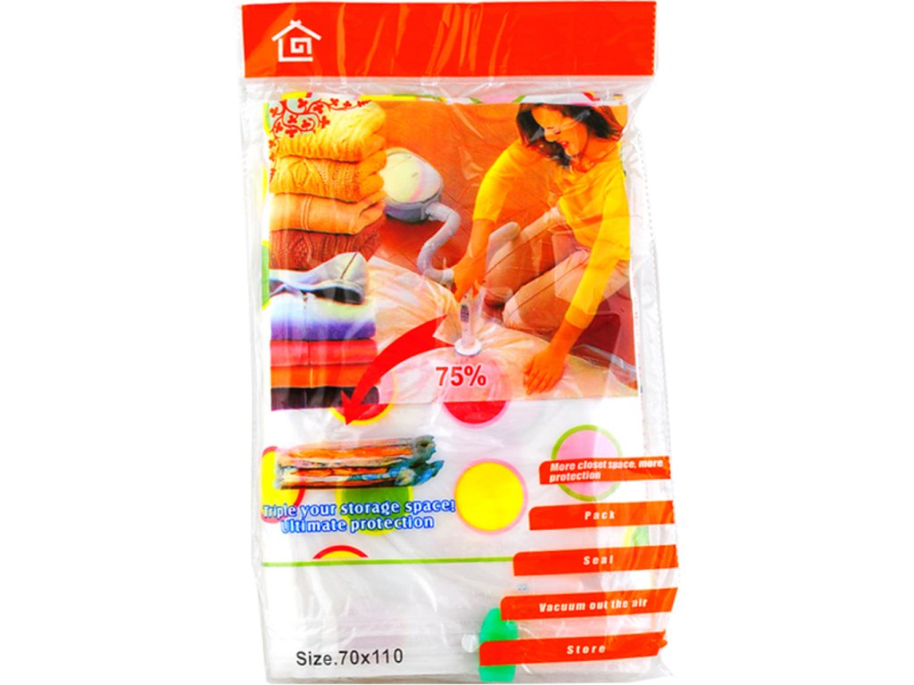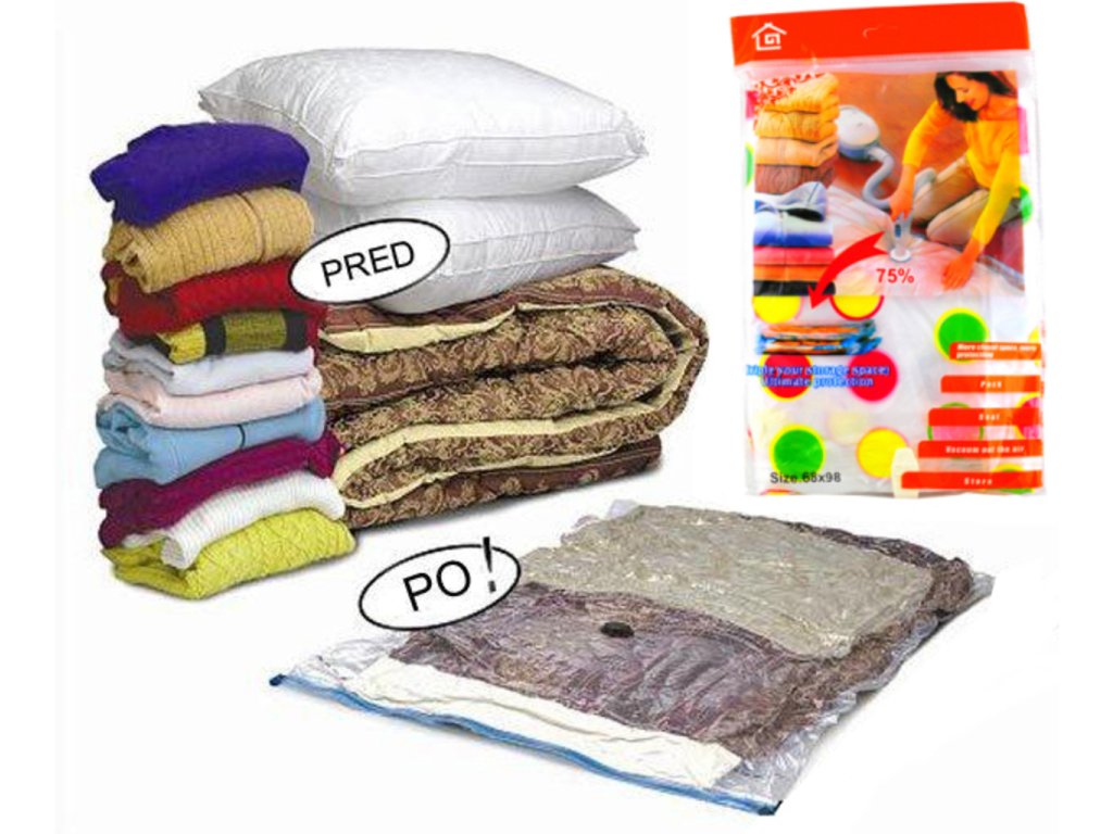 Máte-li doma hodně oblečení, povlečení, prostěradel či jiných tkanin a potřebujete je uskladnit, vakuový pytel pro Vás představuje správné řešení. Díky němu totiž snadno uskladníte velký objem tkanin do menšího prostoru. Celá technologie je založena na principu odsátí vzduchu, díky čemuž se objem pytle zmenší až o dvě třetiny. Naskytne se Vám tak možnost uložit nepotřebné textilie mnohem efektivněji a přehledněji. Praktický dárek do domácnosti.