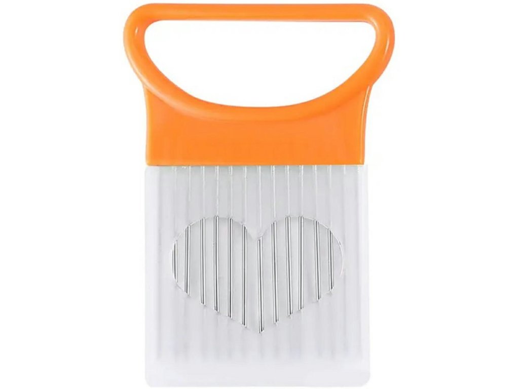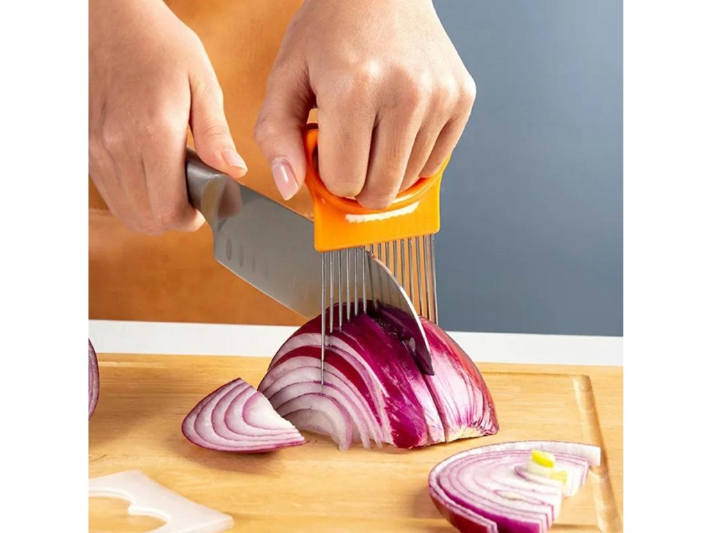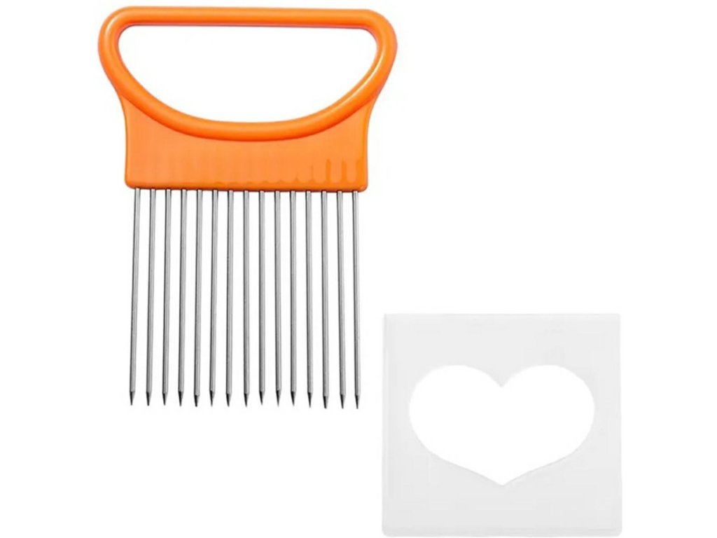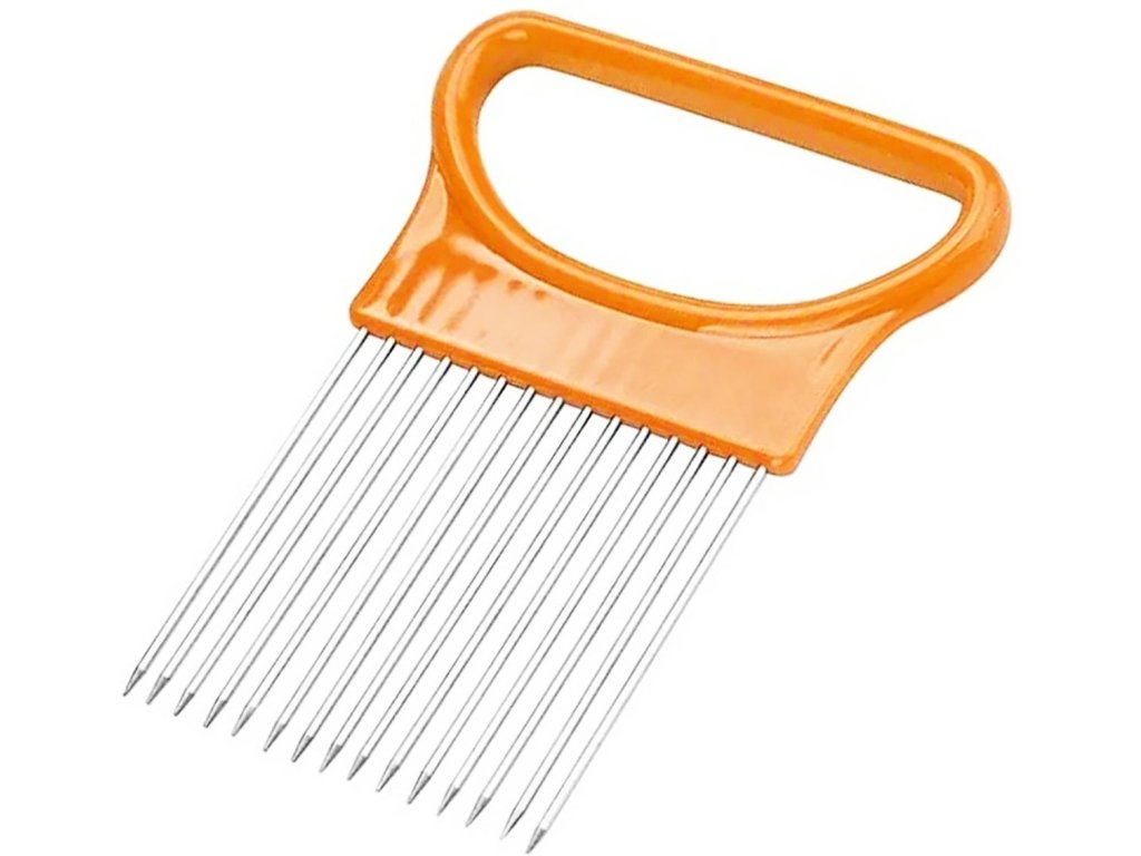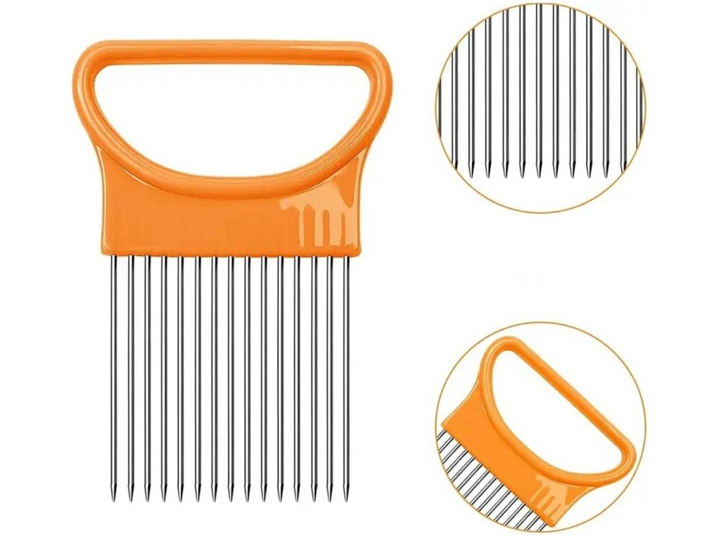 - Vložené ocelové jehly a pohodlná rukojeť umožňují krájet cibuli na rovnoměrné proužky.