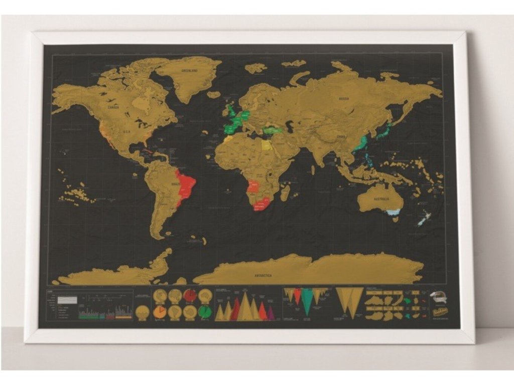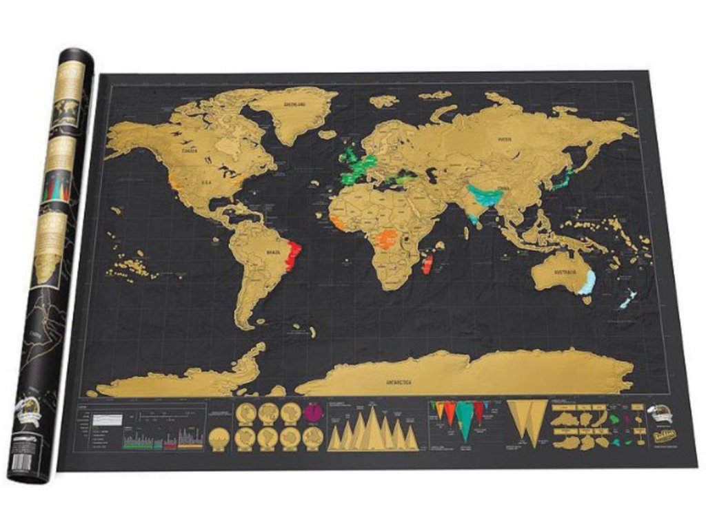 Představujeme Vám stírací mapu světa deluxe černá, ideální dárek ne jen pro ty, co rádi cestují, ale i pro ty, co by rádi cestovali. Scratch map je speciální mapa světa, která je pokryta stírací hliníkovou fólií. Stačí hrubším předmětem setřít tuto zlatavou barvu, jako při stírání losu, a objeví se barevné zobrazení států. Takto si můžete na mapě označovat místa, která jste navštívili, místa, která byste navštívit chtěli, a nebo místa o kterých se zrovna učíte ve škole. Odhalíte velké množství faktů a informací o zemi a oceánech. Udělejte tímto dárkem radost ne jen sobě, ale i těm, kteří chtějí objevovat svět. Stírací mapa světa deluxe černá je originální dárek pro každého.