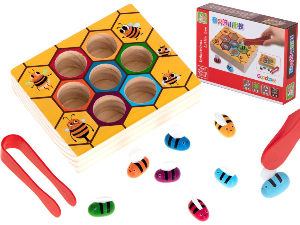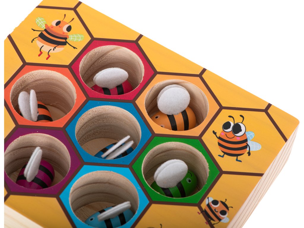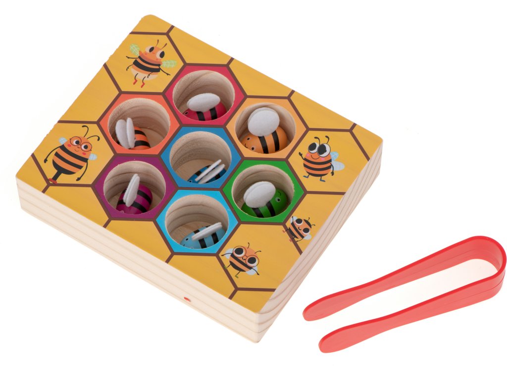 Krásně vyrobená dřevěná hra ve stylu Montessori, kterou si zamilují ti nejmladší. Sada obsahuje 7 včel - každá v jiné barvě a desku / základnu z masivního dřeva. Na základě vtipného obrázku s voštinovým vzorem. Dřevěné včely mají křídla vyrobená z plstěného materiálu, který s odlišnou strukturou navíc stimuluje u malých dětí pocit dotyku. Úkolem dítěte je vyjmout barevné včely pomocí připojené pinzety a poté každou z nich umístit do díry odpovídající barvě. Opakujte hru a snažte se dělat činnosti ještě rychleji.