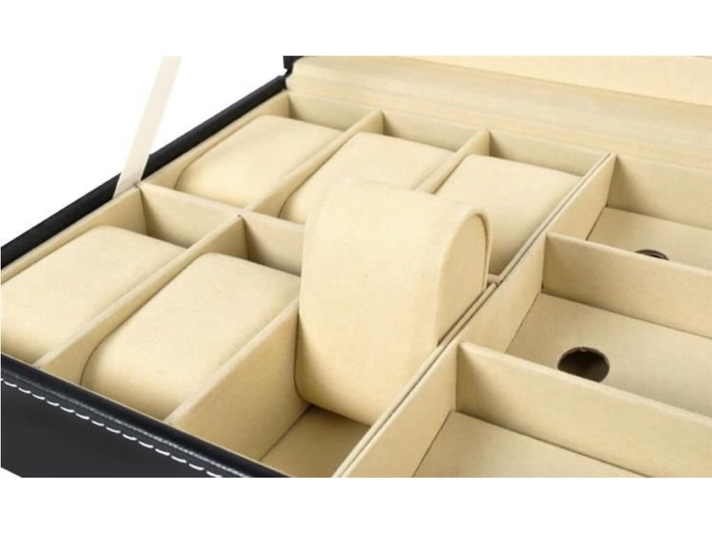 Patříte mezi vášnivé milovníky hodinek? Máte jich doma spoustu a rádi byste pro ně našli lepší místo, než je povalovat v šuplíku nebo skříňce? Tento praktická organizér na hodinky je ten pravý pomocník pro Vás. Organizér hodinek a brýlí má vnitřek vycpaný speciálním, velmi měkkým materiálem. Materiál chrání obsah pouzdra před poškrábáním. Prostory jsou od sebe odděleny vyššími stěnami, což chrání uložené příslušenství před nežádoucím kontaktem, který by mohl způsobit poškození. Krabice má také speciální stuhu, která podporuje otevřené víko. Víko také chrání interiér a obsah krabice. Proti náhodnému rozlití obsahu organizéru chrání také extrémně estetický a bezpečný uzávěr pomocí západky, která má navíc zámek, k sadě je připevněn klíč - umožňuje úplné uzavření a ochranu šperků. Šikovný a skladný organizér poskytuje prostor pro Vaši sbírku hodinek, které budou v bezpečí a nehrozí jim žádné poškození. Praktický organizér ocení každý, komu na své sbírce hodinek záleží. Organizér na hodinky je originální dárek do domácnosti.