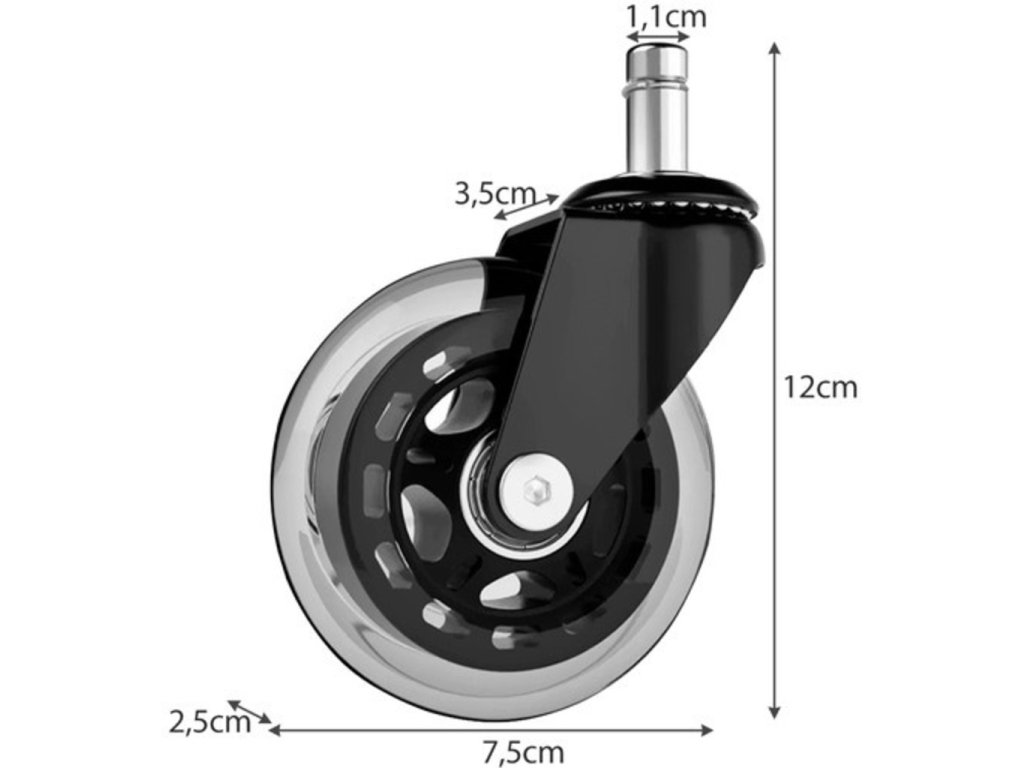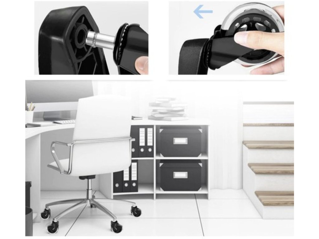 Naše univerzální kolečka jsou ideálním řešením pro kancelářské, herní, otočné a dětské židle. Kompatibilní s většinou domácích i mezinárodních výrobců, tato kolečka chrání vaše podlahy díky použití gumy, která zabrání poškrábání a udrží vaše koberce v perfektním stavu. Už žádná potřeba těžkopádných a nevzhledných podložek! Kolečka jsou navržena s ložiskovým uložení, což zajišťuje tichý a plynulý pohyb, zatímco protiskluzový povrch vám umožní plně kontrolovat směr a intenzitu pohybu. Sada pěti koleček je vhodná pro většinu židlí dostupných na trhu s průměrem osy 11 mm, což umožňuje jednoduchou výměnu celé pětiramenné základny vašich židlí. Montáž je snadná a rychlá díky metodě „zatlač a zacvakni“. Stačí jen stisknout kolík a vaše židle získá nový život! Nechte vaše pohyby po místnosti probíhat hladce a tiše s našimi kolečky.