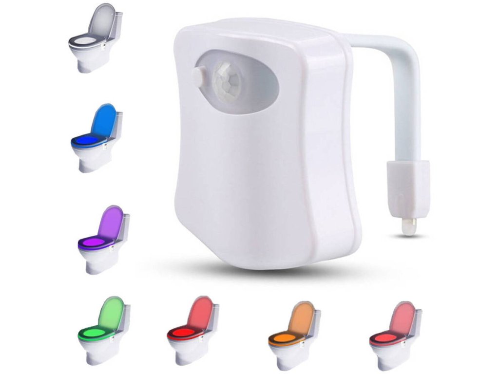 LED osvětlení na WC slouží jako noční osvětlení toalety, není již nutno rozsvěcovat světlo. LED osvětlení na WC rozzáří Vaši toaletu pomocí 8 barev. Když chcete jít večer na WC, již nemusíte rozsvěcovat světlo a ničit si oči. Stačí si přidělat noční LED osvětlení na toaletu, ve tmě se světlo Vaším pohybem aktivuje, tzn., že se zapne, když přijdete na WC a vypne se, když odejdete. I děti bude bavit chodit na toaletu!
