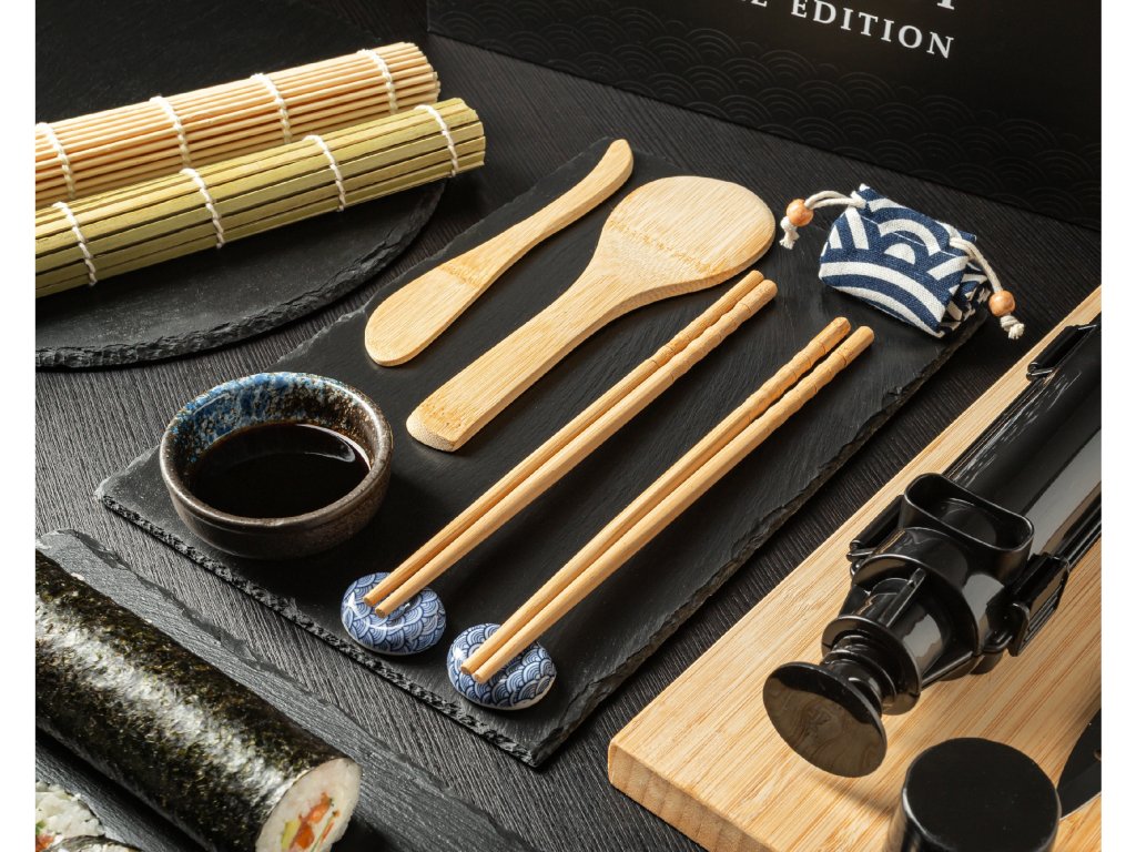 • Sada obsahuje: dvě bambusové podložky na rolování rolek, tubus (váleček) na rýži, nůž na krájení sushi rolek nebo ryb, bambusovou lžíci na servírování rýže, bambusovou špachtli na roztírání rýže, dva páry bambusových hůlek, dva keramické stojánky na hůlky, keramickou misku na sójovou omáčku nebo zázvor, stylový textilní obal na hůlky.