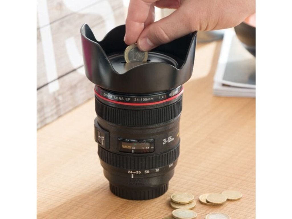 Pokladnička objektiv je dokonalá kopie objektivu. Do pokladničky lze vkládat mince i bankovky díky odnímatelné horní části, na které je otvor pro vkládání mincí. Díky tomuto můžete našetřené penízky kdykoliv vytáhnout. Tato pokladnička určitě potěší všechny fotografy a milovníky pohledu do objektivu. Pořiďte si tento skvělý produkt a naspořte si třeba na dovolenou a nebo pokladničku darujte Vašim blízkým.