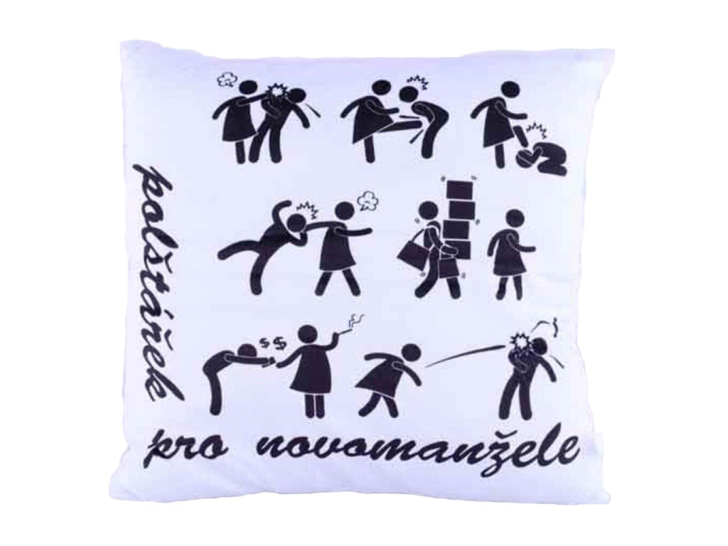 Mají novomanželé ve Vašem okolí velký smysl pro pro humor, berou život s nadhledem a jsou při hodně okolnostech nad věcí. Pak pro ně budete mít velmi vtipný dárek v podobě polštářku - pro novomanželé. Tento polštářek Vám a obdarovaným bude připomínat mnoho vtipných a zažitých stereotypů a scén manželského života. Tento motiv nejenom že pobaví, ale zároveň bude fungovat jako takový zdvižený pomyslný prst, k čemu nesmí sklouznout v manželství mladý pár, aby byl svazek nádherným a poklidným místem v dnešní hektické době a mohl tak vydržet dlouhá léta. Vzpomínka na svatební den v podobě polštářku určitě potěší každou novomanželskou dvojici. Skvělý tip na dárek na svatbu.