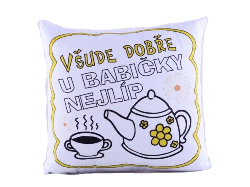 Bude mít vaše babička narozeniny a vy ji chcete obdarovat něčím výjimečným stejně tak, jak je výjimečná ona? Obdarujte ji polštářkem všude dobře. Polštářek je příjemný na dotek a pohodlný na spánek nebo odpočinek. Má krásný potisk s nápisem a obrázek konvičky s šálkem. Určitě si všichni vzpomínáte na zlaté časy trávené u babičky, kde jste byli na prázdninách. Oplaťte ji chvíle, kdy se o Vás babička starala tímto skvělým polštářkem. Hodí se k jakékoliv příležitosti. Pořiďte babičce tento polštářek a řekněte ji tím, že je nejlepší.