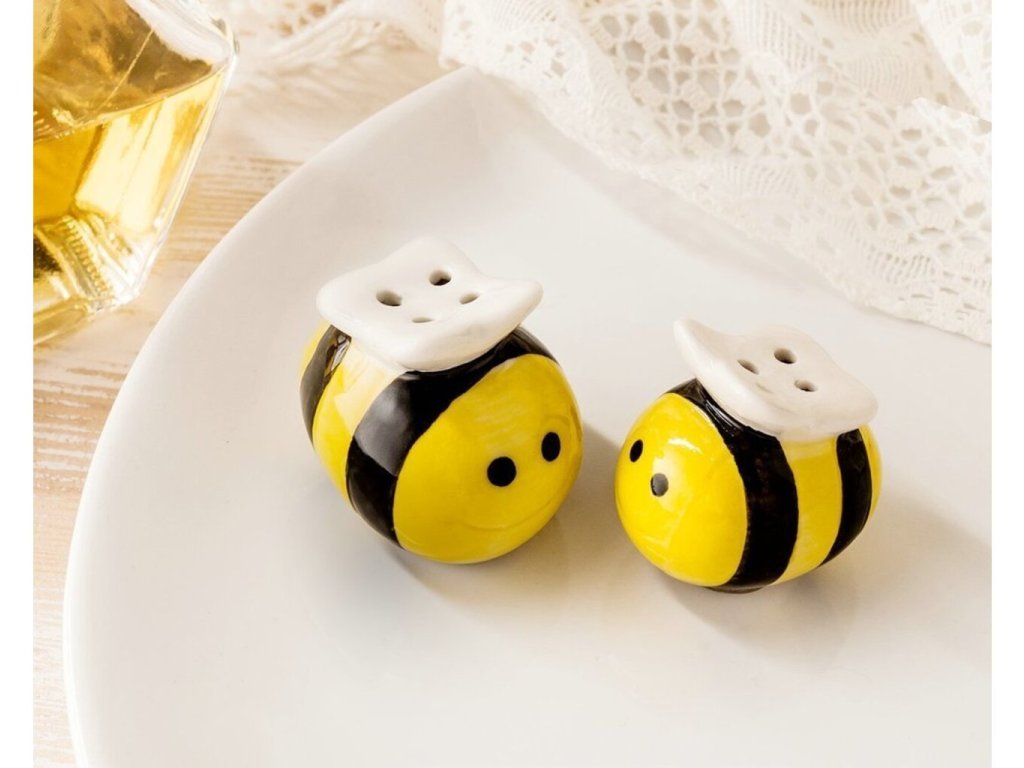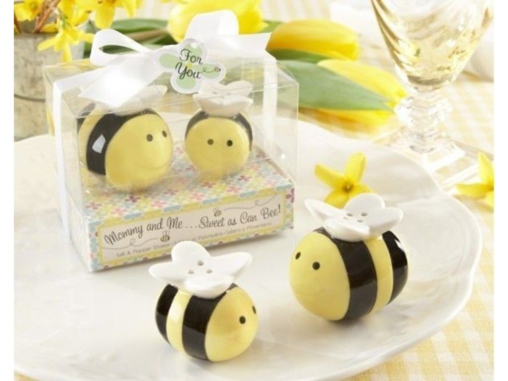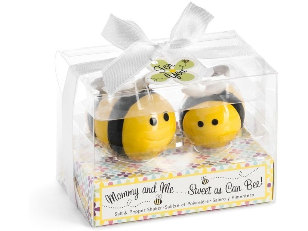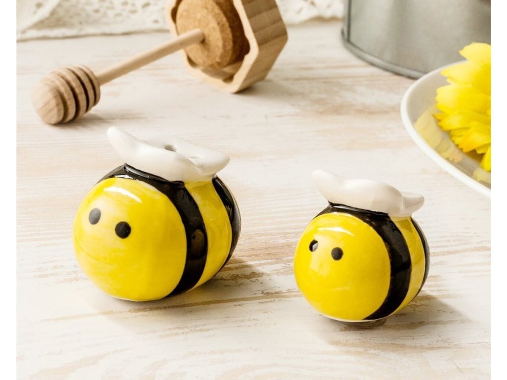 Máte v rodině včelaře a chtěli byste jim udělat radost? Tato roztomilá slánka s pepřenkou ve tvaru včeliček potěší každého milovníka včel. Slánka a pepřenka včelky dokonale ozdobí Váš stůl a zpříjemní atmosféru při stolování, až se na každého budou usmívat tyto dvě rozzářené včeličky. Ozdobte svůj stůl, obdarujte své kamarády a příbuzné včelaře a zajisté jim touto netradiční včelí dekorací uděláte radost. Slánka a pepřenka včelky jsou originálním dárkem do kuchyně.