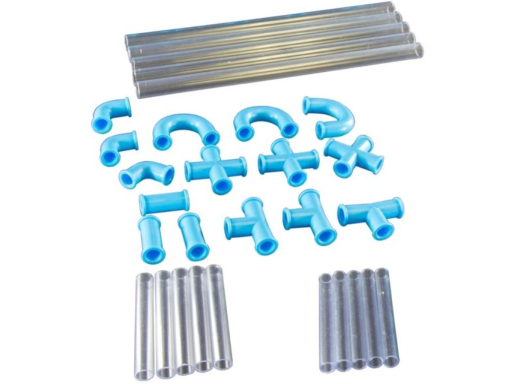 - Balení: obsahuje 19 dílků (2ks T, 3ks I, 5ks koleno, 9ks trubiček různé délky)