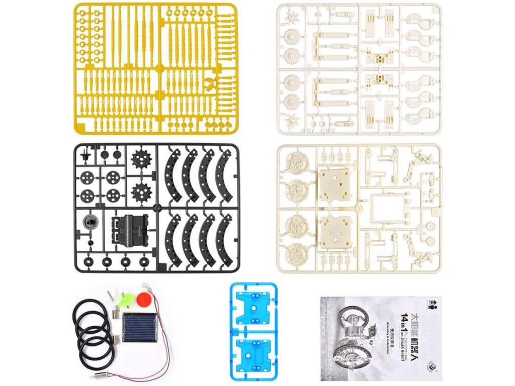 - Zahrnuje motor, převody, houby, nálepky a solární panel s pružinami