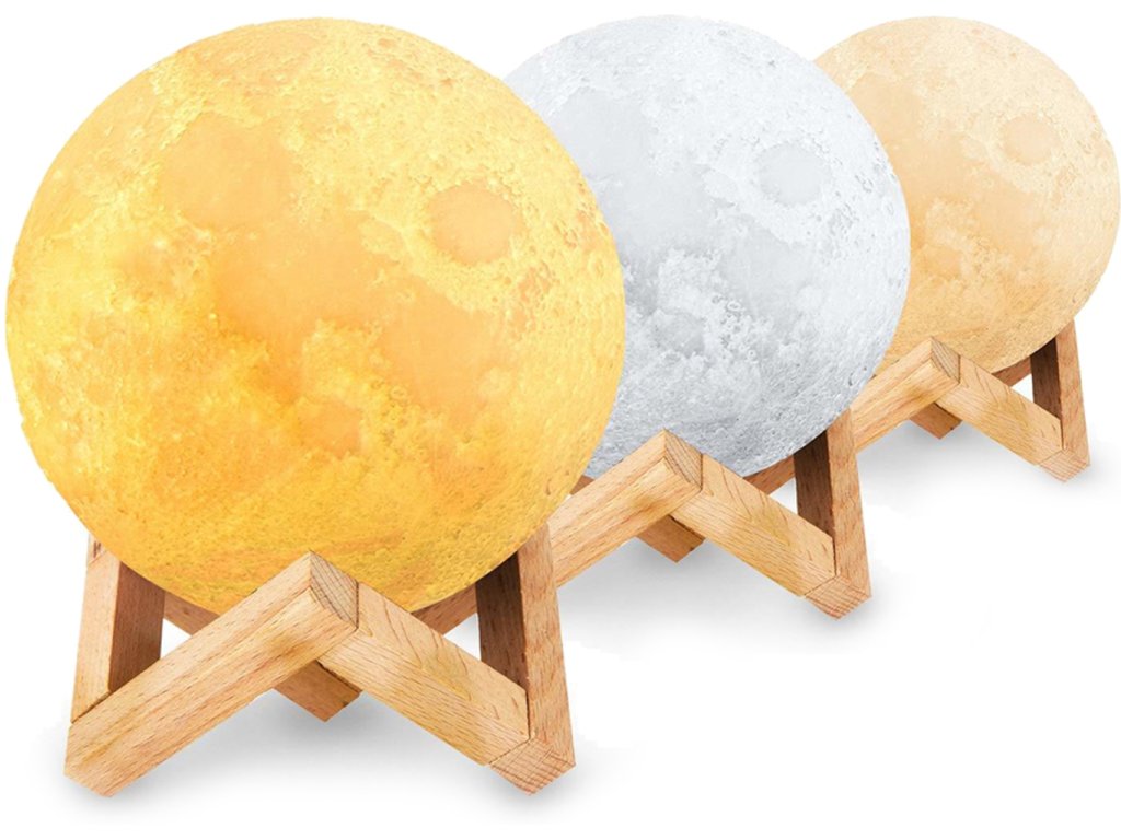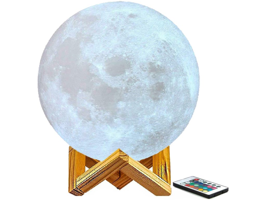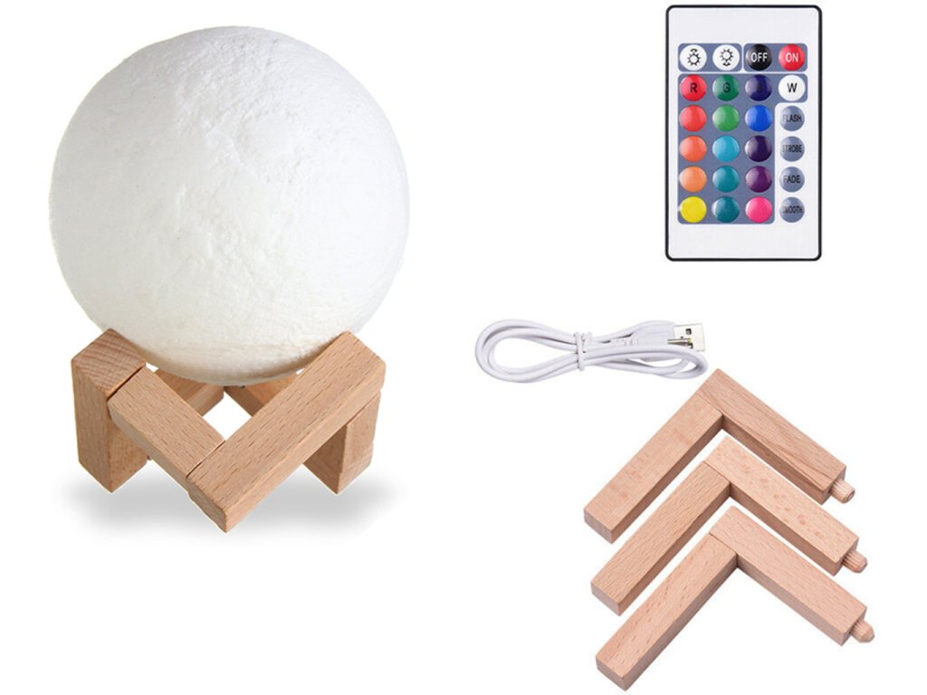 Lampička 3D Měsíc 14 cm, 12 barev byla vyrobena s využitím inovativní technologie 3D tisku, díky které dokonale napodobuje náš měsíc. Má hrubou strukturu a každý kráter na něm odpovídá tomu skutečnému. Pokud sníte o usnutí pod jasným, zářícím měsícem, tato lampa vám dává takovou příležitost. Má 12 barev světla, 4 režimy, během kterých je lampa automaticky mění. Režimy lze volit pomocí praktického dálkového ovladače nebo dotykem na spodní část lampy. Lampa je navíc napájena přes USB kabel, takže nabíjení je pohodlné a není třeba baterii vyměňovat. (doba nabíjení přibližně 3 hodiny). Tato designová lampa je ideální do každého interiéru. Bude to vypadat působivé v dětském pokoji, ložnici nebo v obývacím pokoji. Můžete ho dát večer na noční stolek nebo na poličku nad ním, a když svítí, v místnosti převládne jedinečná atmosféra. Imitace měsíce byla vyrobena z ekologického materiálu bez zápachu, kterým je polyaktid. Je plně biologicky rozložitelný. Získává se z obnovitelných surovin, jako je kukuřičná moučka. Nemá nepříznivý vliv na zdraví a jeho světlo lze upravit podle vašich představ. Z tohoto důvodu je také skvělý pro pokoj nejmladších obyvatel domácnosti.