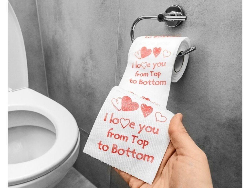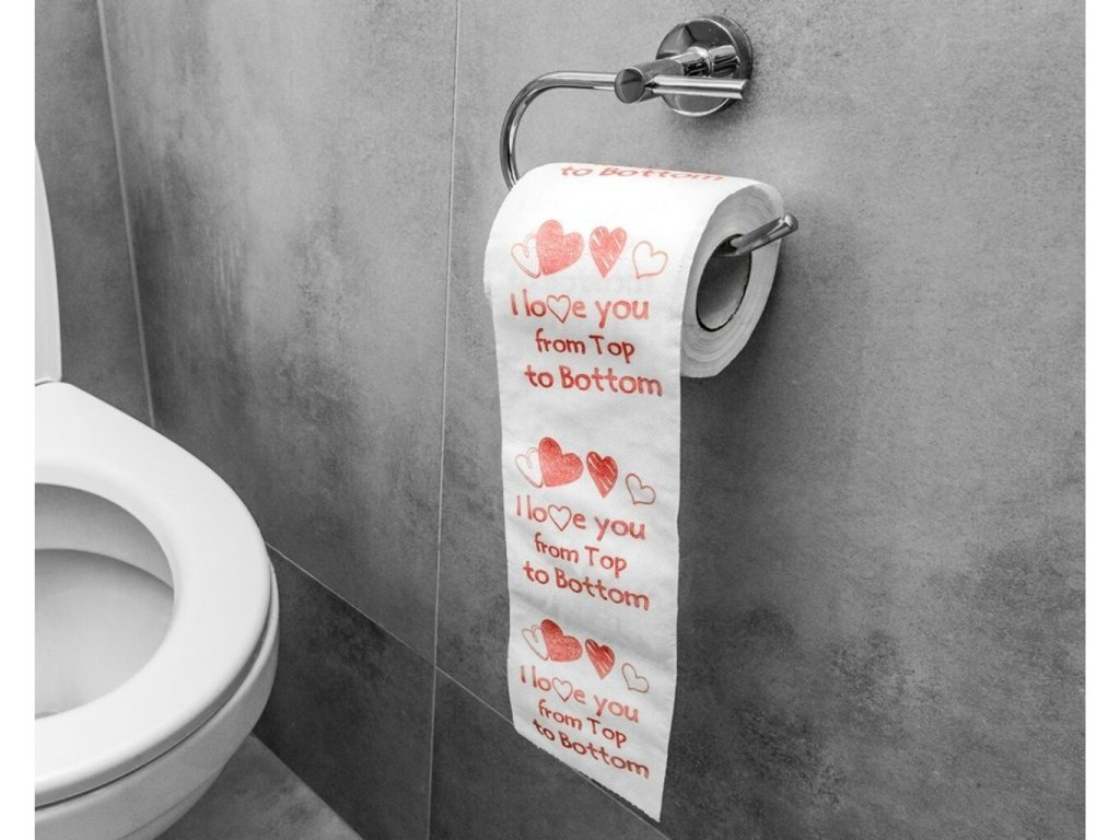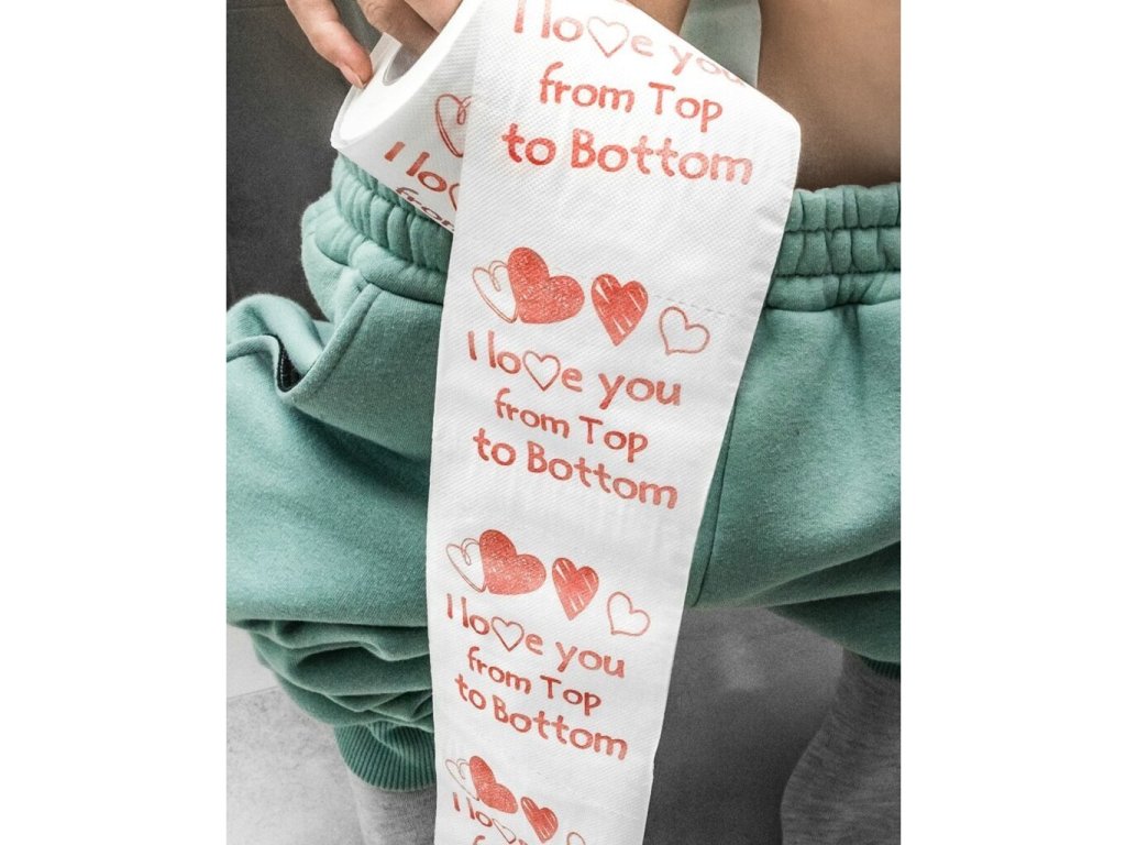 Dosud takový toaletní papír nebyl, i když se můžete přiblížit k tématu, že život je jako toaletní papír, šedý, dlouhý atd. .... Písmo na papíře jasně ukazuje, že je to všechno o lásce od hlavy k patě. Toaleta se může zdát nějakému nepříliš vhodnému místu pro taková ohnivá prohlášení, ale podle našeho názoru vždy a kdekoli je dobré vyznávat lásku, a tak netradičním způsobem to může jen zvýšit účinek překvapení a posílit vzájemnou zamilovanost. Vyznejte svou lásku svému manželovi, příteli, milenci na Valentýna, narozeniny nebo jen tak každý všední den.