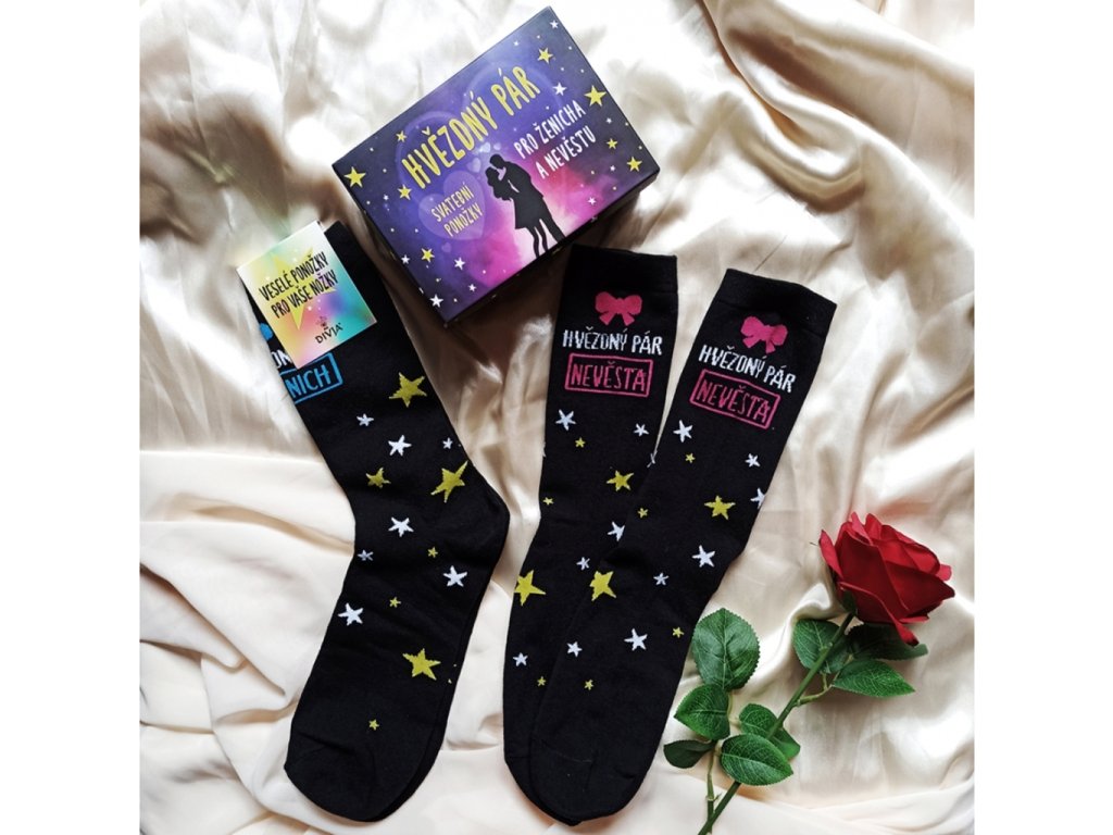 Originální sada veselých ponožek pro NEVĚSTU a ŽENICHA. Pořiďte si tyto veselé ponožky na Váš velký den nebo je darujte budoucím novomanželům. Vhodné jako dárek na svatbu, rozlučku se svobodou nebo každodenní příležitost, která se týká svatby. Neobyčejné ponožky rozzáří každou správnou veselku!